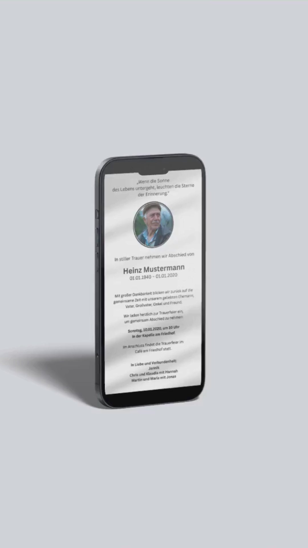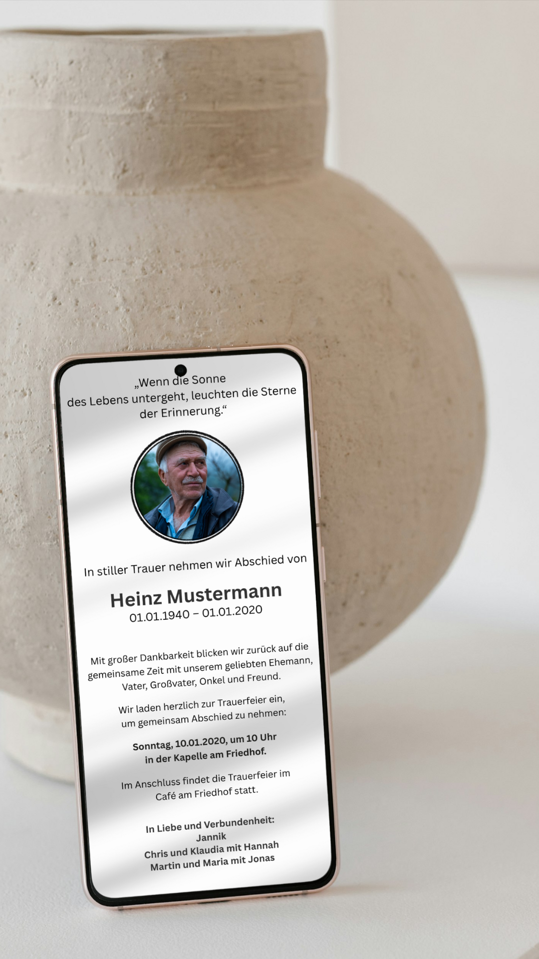 Die Karte kann individuell gestaltet und direkt per WhatsApp, E-Mail oder Nachricht verschickt werden. Eine wertschätzende, moderne Form der Einladung zur Beisetzung – einfach und doch tief berührend.