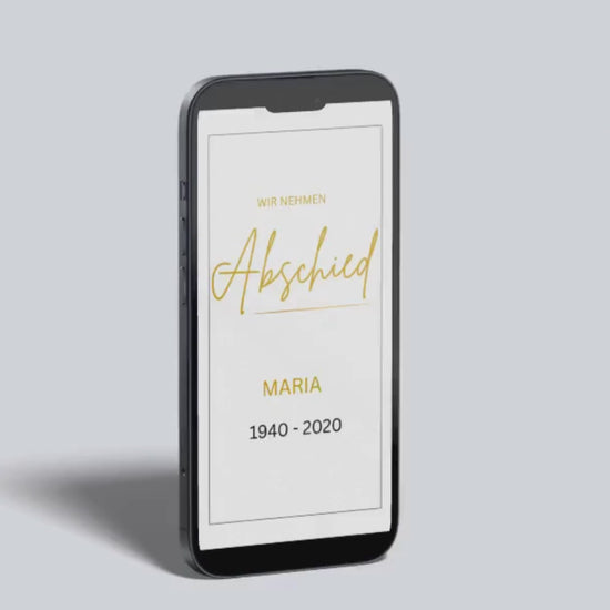 Mit dieser stilvollen, zweiseitigen Trauerkarte nehmen Sie würdevoll Abschied von einem geliebten Menschen. Die digitale Karte im modernen Design ist bewusst schlicht gehalten – klare Typografie, ein edler Schriftzug „Abschied“ in Gold sowie dezente Gestaltungselemente verleihen ihr eine zeitlose Eleganz.