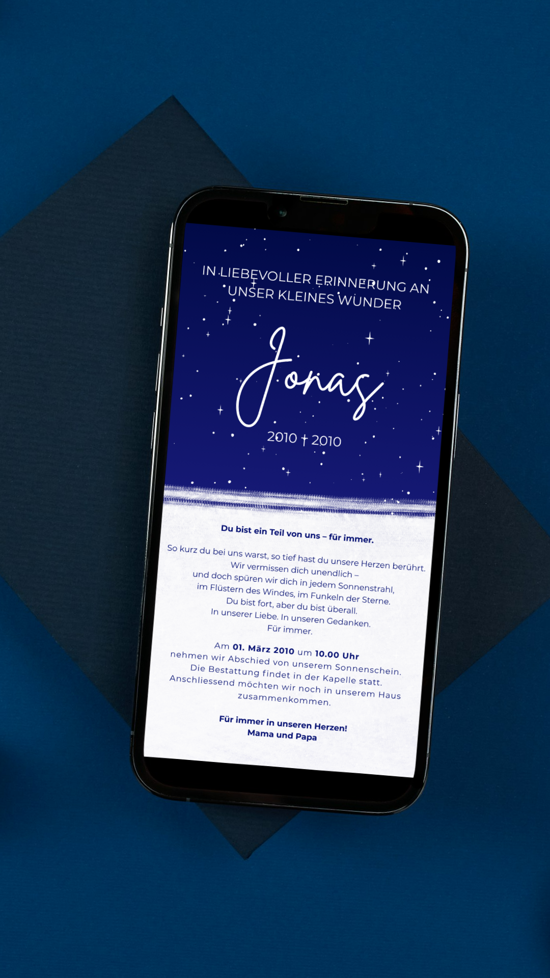 Digitale Trauerkarte für ein verstorbenes Kind – liebevoll gestaltet mit Sternenhimmel